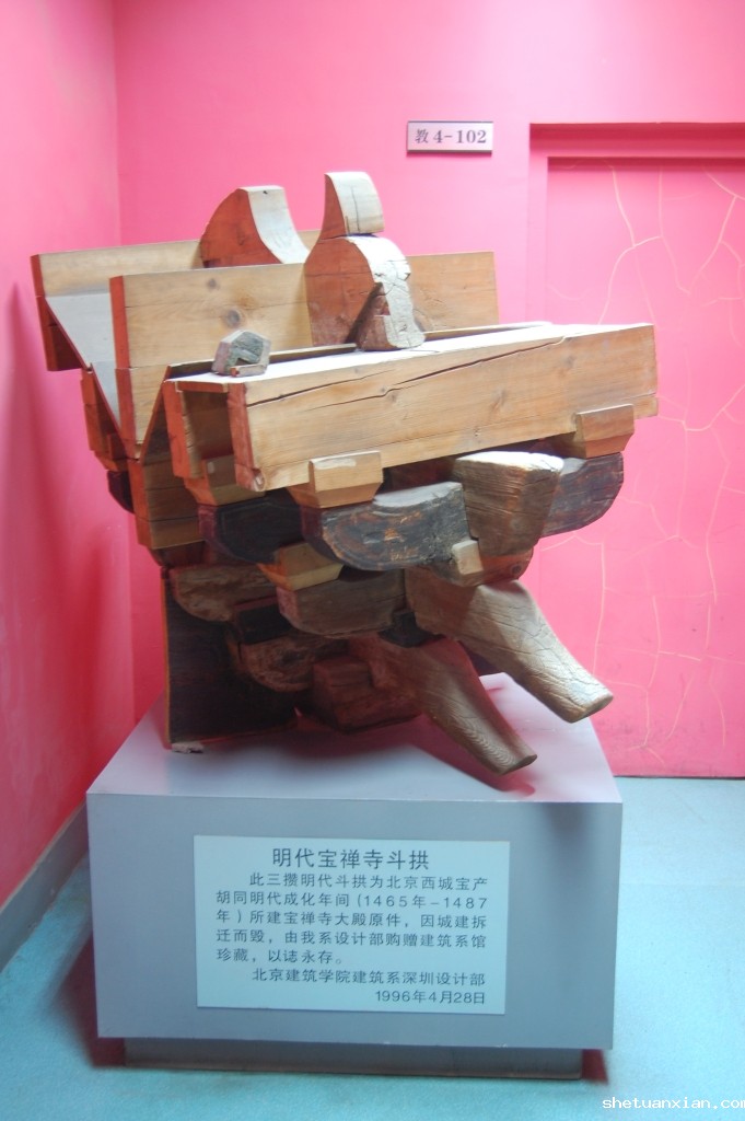 学院一层东侧及二层东西两侧,摆放着三件教学模具——明代三攒宝禅寺斗拱。此三攒明代斗拱,为西城区宝产胡同明成化年间(1465-1487年)所建的宝禅寺大殿元件,因为城建拆迁而毁,建筑学院早年购得摆放在院馆,既为珍藏,又营造了院馆的学术氛围,同时为学生近距离了解古建筑,开展古建测绘课程实践提供了便利。院馆走廊两侧及教学3号楼1-4层教室外墙,加装着通透的橱窗,这为举办各类高级别学术展览、学生作业展及模型展提供了良好的空间环境,同时也为教师评图,学生交流提供了条件。为展示建筑学院形象,近年来建筑学院又在相关空间环境统一制作了带有楼层索引的标识引导系统,通过标识引导系统的制作,既展现了学院历史,又为校内外人员到院办事提供了便利。