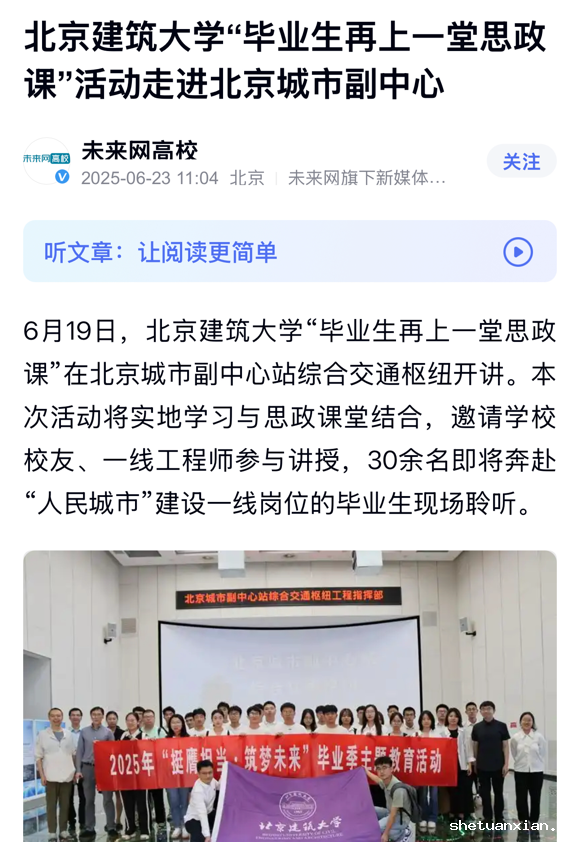 6月19日,kaiyun体育网页版官方网“毕业生再上一堂思政课”在北京城市副中心站综合交通枢纽开讲。本次活动将实地学习与思政课堂结合,邀请学校校友、一线工程师参与讲授,30余名即将奔赴“人民城市”建设一线岗位的毕业生现场聆听。