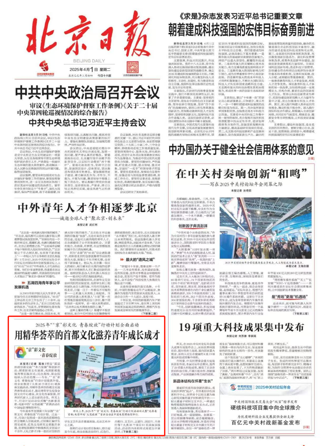2025年是本市连续第三年实施“‘京’彩文化 青春绽放”行动计划。过去一年,行动计划形成一系列具有首都特色的立德树人创新成果,已结集汇编学生理论成果、红色文化研究文章数百余篇,创意短视频和中轴线相关文创设计千余件,《天之骄子》等一批结对创排的学生文艺作品在曹禺剧场、北京艺术中心上演。