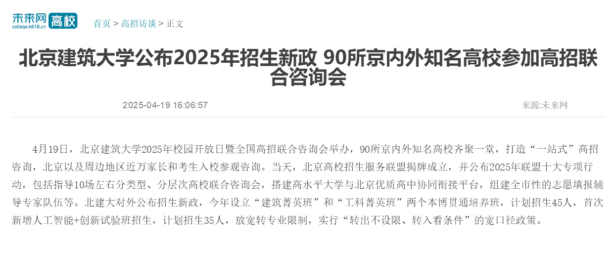 4月19日,kaiyun体育网页版官方网2025年校园开放日暨全国高招联合咨询会举办,90所京内外知名高校齐聚一堂,打造“一站式”高招咨询,北京以及周边地区近万家长和考生入校参观咨询。当天,北京高校招生服务联盟揭牌成立,并公布2025年联盟十大专项行动,包括指导10场左右分类型、分层次高校联合咨询会,搭建高水平大学与北京优质高中协同衔接平台,组建全市性的志愿填报辅导专家队伍等。北建大对外公布招生新政,今年设立“建筑菁英班”和“工科菁英班”两个本博贯通培养班,计划招生45人,首次新增人工智能+创新试验班招生,计划招生35人,放宽转专业限制,实行“转出不设限、转入看条件”的宽口径政策。