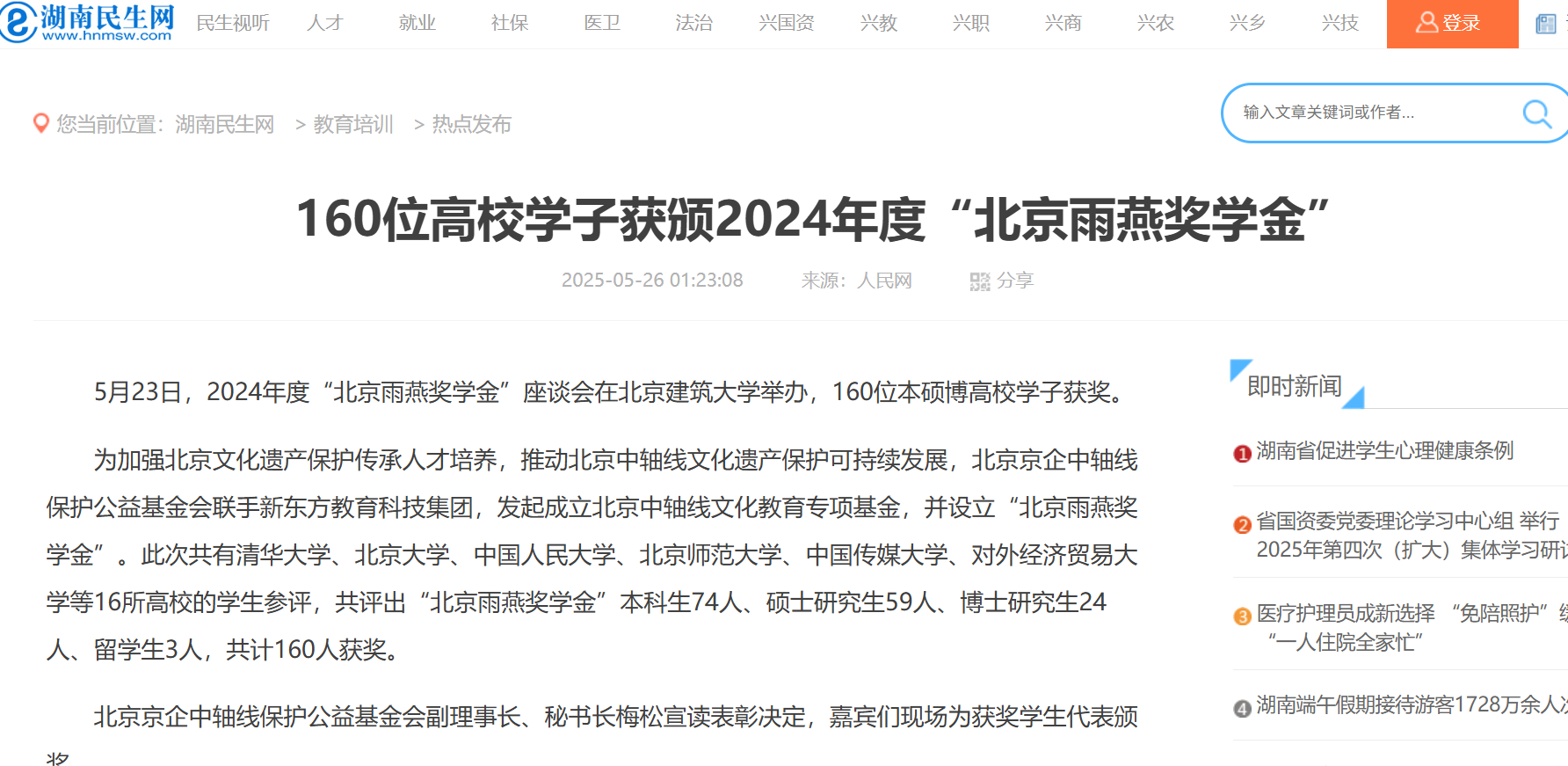 为加强北京文化遗产保护传承人才培养,推动北京中轴线文化遗产保护可持续发展,北京京企中轴线保护公益基金会联手新东方教育科技集团,发起成立北京中轴线文化教育专项基金,并设立“北京雨燕奖学金”。此次共有清华大学、北京大学、中国人民大学、北京师范大学、中国传媒大学、对外经济贸易大学等16所高校的学生参评,共评出“北京雨燕奖学金”本科生74人、硕士研究生59人、博士研究生24人、留学生3人,共计160人获奖。