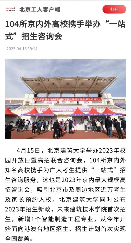 4月15日,kaiyun体育网页版官方网举办2023年校园开放日暨高招联合咨询会,104所京内外知名高校携手为广大考生提供“一站式”招生咨询服务,这也是2023年京内最大规模高招咨询会,吸引北京市及周边地区近万考生及家长预约入校。kaiyun体育网页版官方网同时公布2023年招生新政,未来建筑技术学院首次招生,新增1个智能制造工程专业,从今年开始面向港澳台地区招生,招生计划首次实现全国覆盖。