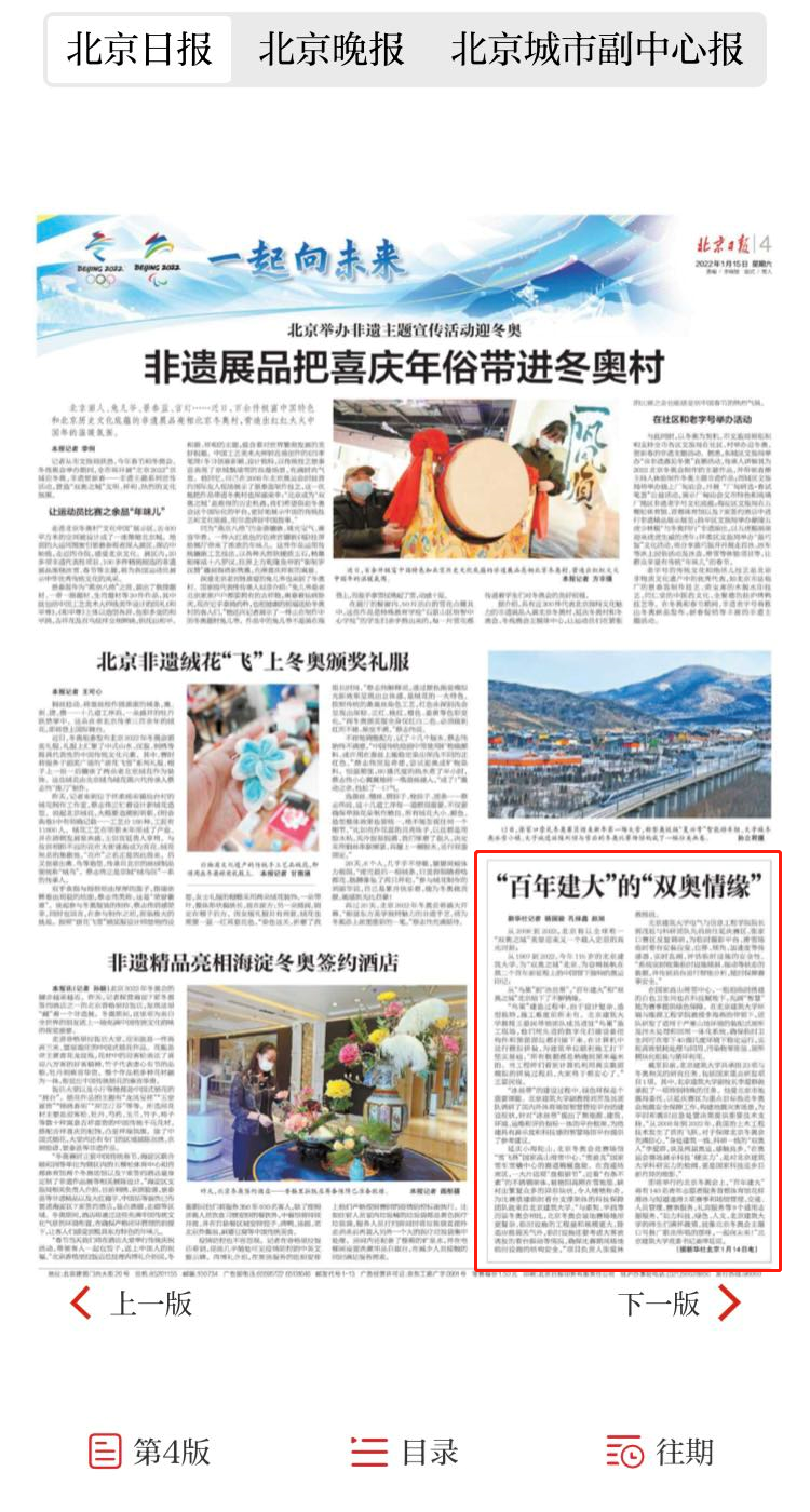 1月15日,北京日报在4版《一起向未来》冬奥版面也刊发报道。