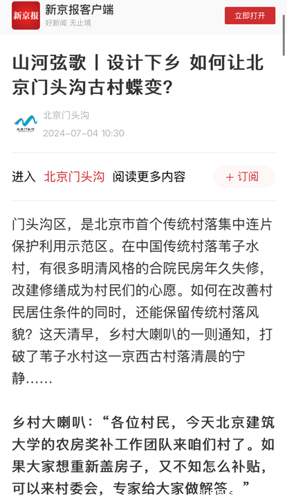 从农房到梯田,再到研学基地、数字档案,驻村设计师们以村庄和山野为画板,赋予这些传统村落新的活力。北京市门头沟区农业农村局传统村落保护利用工作负责人刘嘉羽说,门头沟区的14个传统村落,正在农房风貌奖补政策的引导下,逐步恢复记忆中传统村落的容颜,设计师手中的画笔,描绘着北京最浓的乡愁。“我们提倡村民建设青砖灰瓦、古香古色、院落布局合理的特色民居。在传统村落保护的同时,与诗画乡村建设相融合,推动传统村落的活化利用。”
