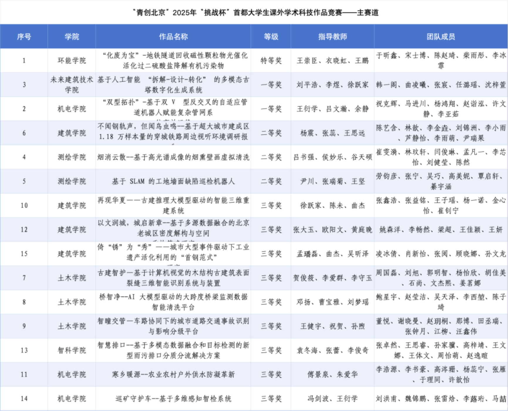 主体赛中,北建大学子表现出色,荣获特等奖1项、一等奖2项、二等奖3项、三等奖9项。环能学院王崇臣、衣晓虹、王鹏老师指导的《“化废为宝”—地铁隧道回收磁性颗粒物光催化活化过二硫酸盐降解有机污染物》项目获特等奖;机电学院王衍学、吕文瀚、余静老师指导的《“双型拓扑”—基于双 V 型反交叉的自适应管道机器人赋能复杂管网系统高效运维》,未来建筑技术学院刘平浩、李煜、徐跃家老师指导的《基于人工智能“拆解-设计-转化”的多模态古塔数字化生成系统》项目获一等奖2项。