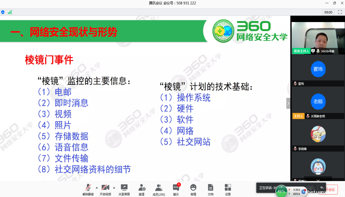 为增强师生国家安全意识,加强国家安全教育,在第五个“全民国家安全教育日”来临之际,电信学院将国家安全教育融入学生专业教育,两手抓两促进。2020年4月14日14点,电信学院邀请360网络安全大学安全研究员孙伟峰,作题为“大安全视角下的网络安全技术”的主题讲座。讲座通过腾讯会议和虎牙直播进行,保卫处处长牛磊、电信学院党委书记张雷、文法学院党委书记刘国朝,电信学院教师、辅导员和相关专业本科生400余人,文法学院部分教工党员参加讲座。讲座由电信学院党委副书记关海琳主持。