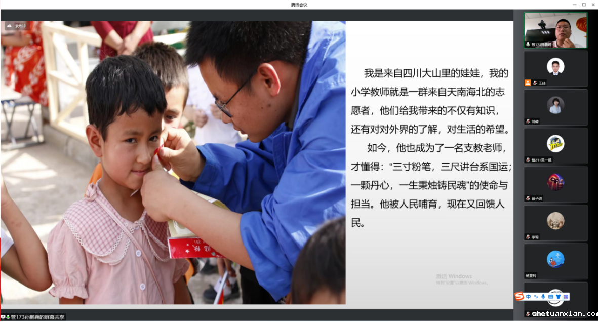活动中,我校三位服务西部的志愿者以自己感人、生动的经历讲述了援藏、援疆以及内蒙支教的服务经历。其中,2021年西部计划西藏志愿者、机电学院石金燚从服务初衷、工作内容与生活保障三方面阐述了他对“援藏精神”的深刻理解。2018年西部计划内蒙古志愿者、经管学院杨光艳,讲述了她在商都县屯垦队中心校2两年支教经历,“给留守儿童家一样的温暖和爱,让希望的光点燃他们对未来的向往”,两年的服务经历也让她决定继续留在西部担任一名小学教师。2021年西部计划新疆志愿者、经管学院的孙鹏翱,介绍了他在新疆和田市服务经历,以及和他同行的志愿者们带领维族儿童认识更广阔的世界所付出的努力,在新疆的志愿者们用青春奉献践行服务人民的宗旨。我校就业辅导中心教师王国亭为同学介绍了参加大学生志愿服务西部计划就业流程与户档留存政策。