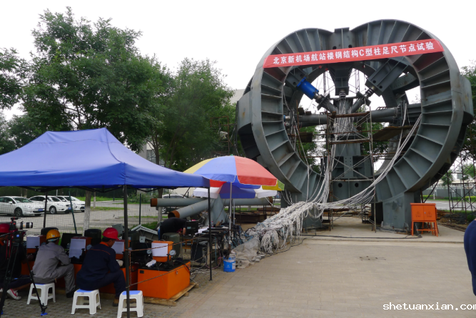 2016年,团队承担了北京大兴国际机场航站楼大跨度钢结构体系的所有试验项目。我负责的任务之一就是通过9组足尺节点试验来验证C形柱设计的安全性。作为世界上规模最大、技术最难的航站楼主要支撑结构,C形柱的节点构造异常复杂,常规设备无法完成这样一个加载试验,于是需要自主研发一套加载装置。