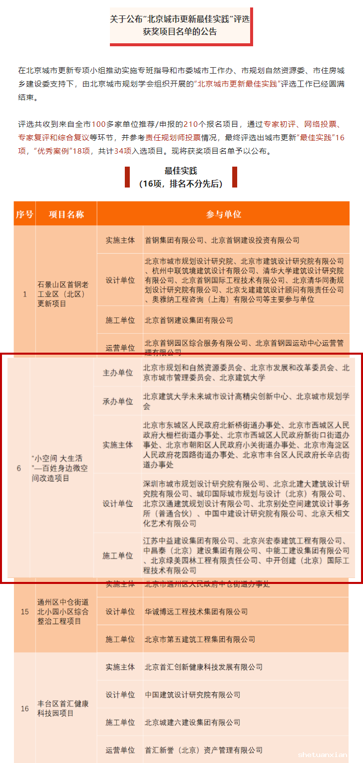 “北京城市更新最佳实践”评选活动旨在宣传北京城市更新优秀实践经验,鼓励更多市场主体参与城市更新。活动由北京城市更新专项小组推动实施专班指导,市委城工办、市住建委、市规自委提供支持,北京城市规划学会具体组织实施,主要征集自《北京城市总体规划(2016年—2035年)》批复以来,全市范围内已完成或阶段性完成并投入使用的民生改善类、产业升级类、活力提升类及其他等四类城市更新项目。评选共收到来自全市100多家单位推荐/申报的210个报名项目,通过专家初评、网络投票、专家复评和综合复议等环节,并参考责任规划师投票情况,最终评选出城市更新“最佳实践奖”16项,“优秀案例奖”18项。