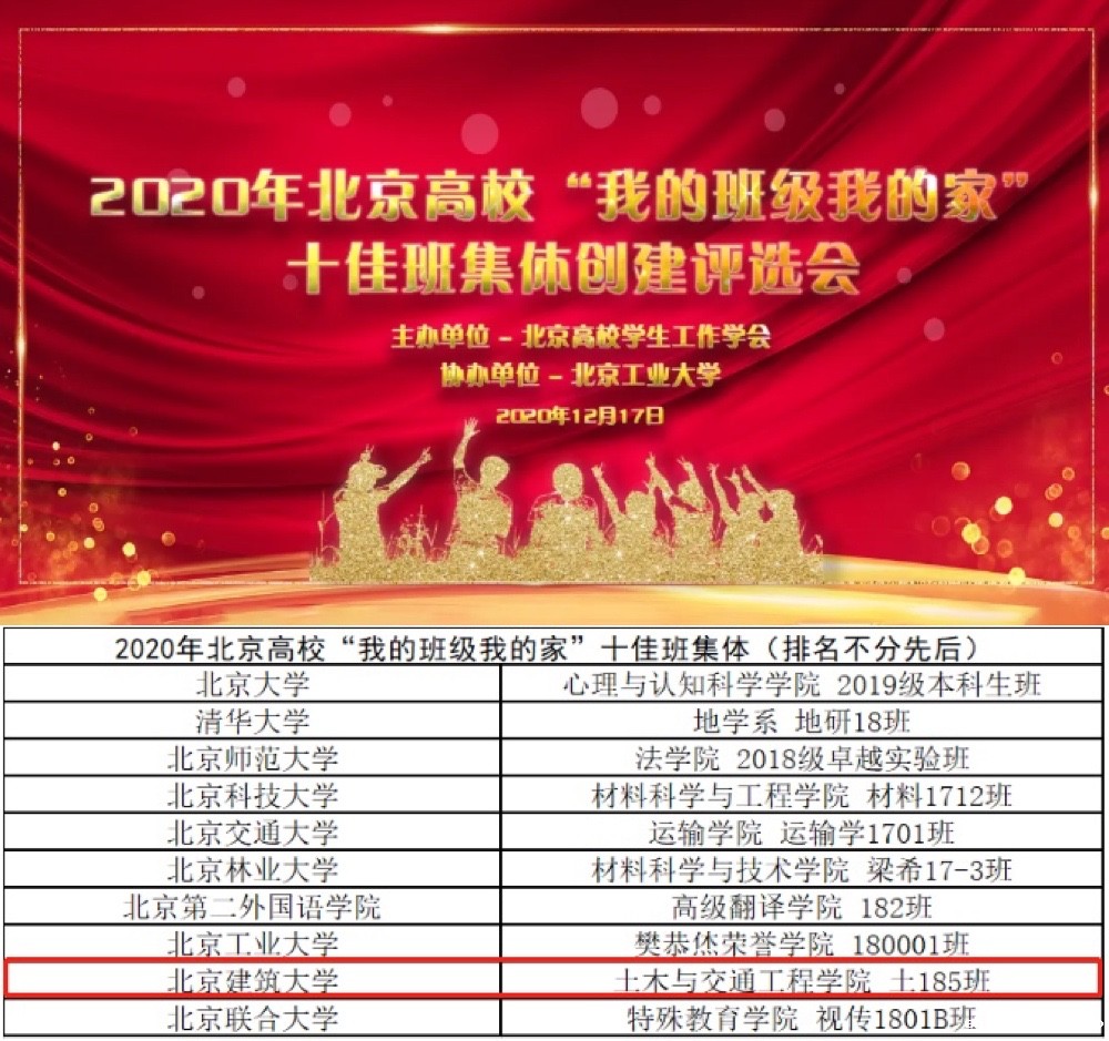 12月17日下午,2020年北京高校“我的班级我的家”优秀班集体创建评选活动在北京工业大学落下帷幕。经过学校推荐、通讯评审和专家现场评议,kaiyun体育网页版官方网土木学院土185班从北京地区53所高校推荐的259个班级中脱颖而出,以第二名的优异成绩荣获北京高校“十佳班集体”荣誉称号。这是学校首次获此殊荣,实现班集体建设历史性突破。
