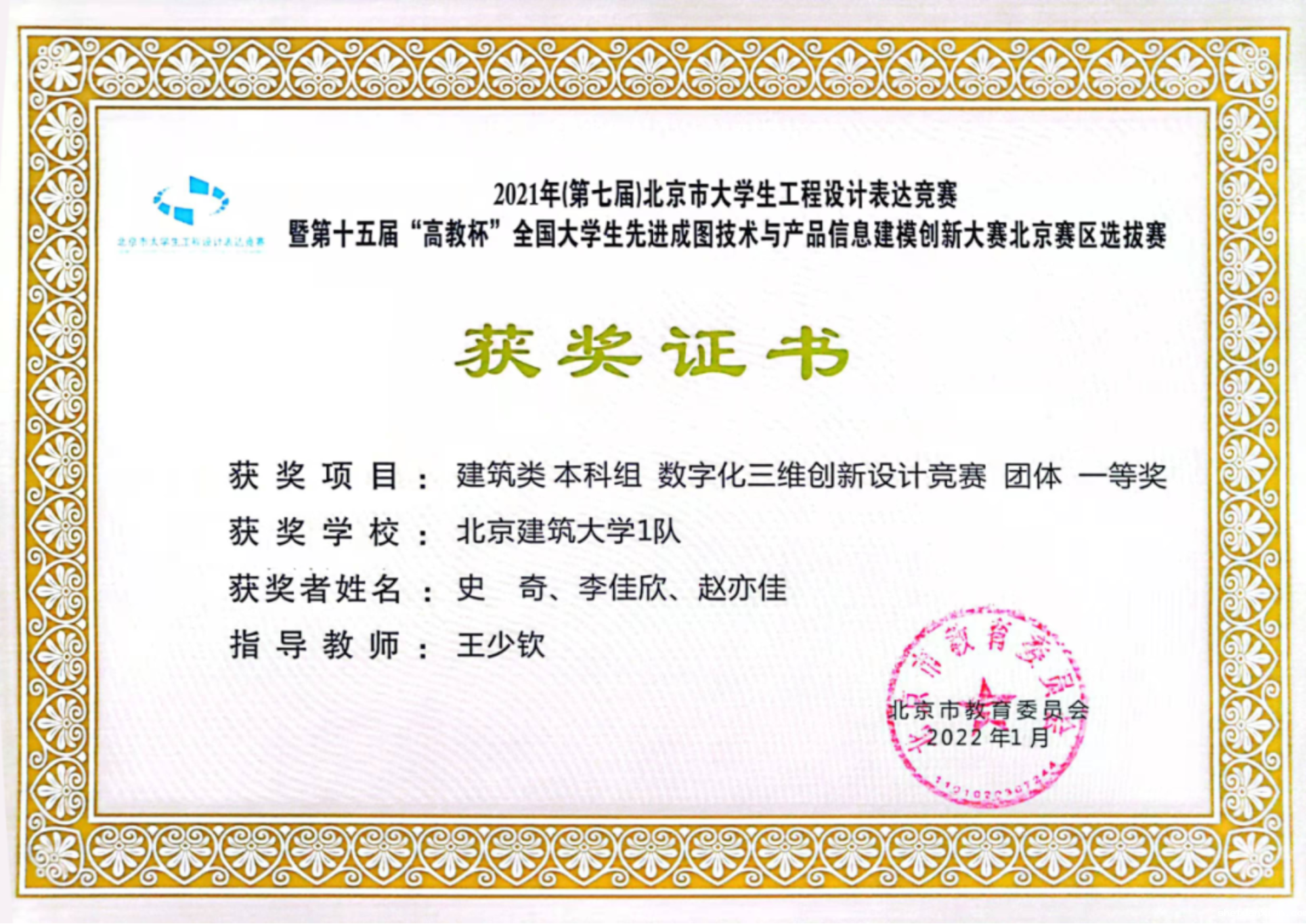 多年来,她和课题组老师杨谆、刘晓然一直利用晚上、周末和暑假的时间加班加点组织竞赛培训,指导了建筑学院、土木学院等各学院多名同学参加北京市及全国图学类建模及绘图竞赛,获得全国特等奖、一等奖、二等奖累计20余项,获北京市一等奖、二等奖累计30余项。