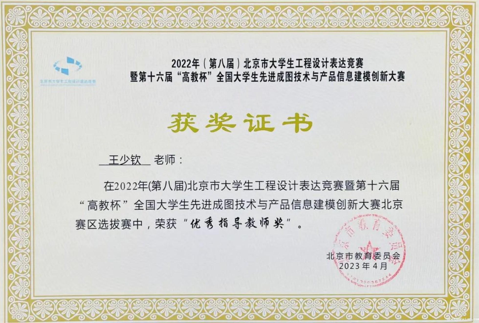 2016年,王少钦接任系主任职务,在保证全校制图类课程正常运转的情况下,整理各类教学资料,配合学校圆满完成本科教学评估,此后并多次组织本系教师申报优秀教学团队。2017年暑假在脚扭伤卧床期间,主笔撰写北京市教学成果奖申报书并总结教学成果,成功获批北京市高等教育教学二等奖。