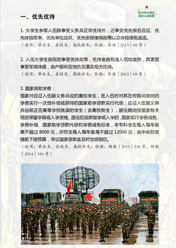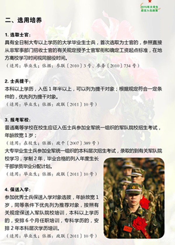 大学生参军入伍安排上优先。优先安排军兵种和技术要求高的部队服役。部队在选取士官、直接提升军官,以及复学毕业后接收补充军队干部队伍等方面给予优待。