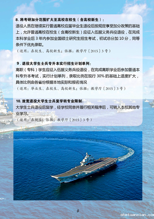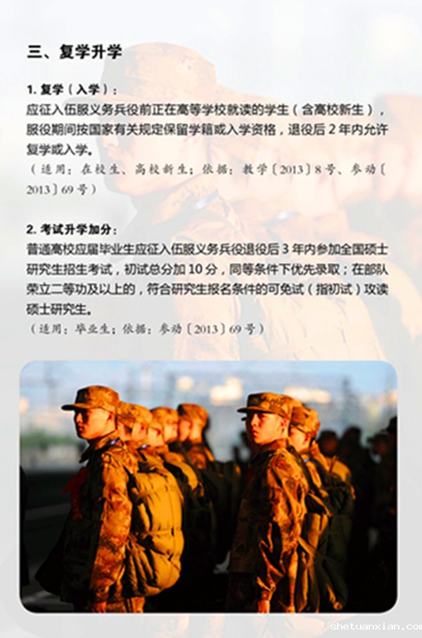大学生参军入伍升学上优待。设置研究生退伍士兵定向招录计划;毕业三年内报考非专项研究生的,初试总分加10分,立二等功及以上的,毕业后可免试推荐硕士研究生。
