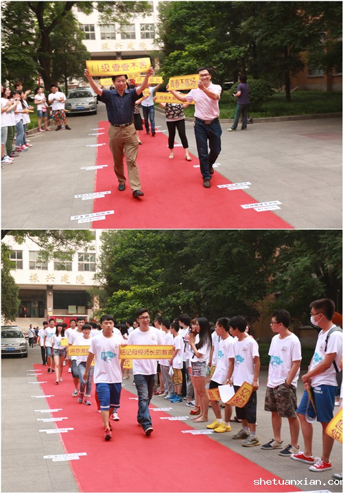 18:00,“创意红毯秀”正式开始。四十余组毕业生身着毕业文化衫,手持“为青春壮行、11级壹壹不舍、情系母校•心念同窗”等毕业标语依次走过红毯,用最青春的姿态诠释着四年的精彩,用最灿烂的笑容展示着四年的收获。红毯两侧标记着2011级学生自入学以来的大事件,同学们沿着红毯行走,仿佛也在时间的维度上延伸开来。伴随着同学们的入场,主持人诙谐幽默的解说引来欢笑不断,师生组合的登场助兴,一次次将红毯入场仪式推向了高潮。“红毯秀”压轴入场的是学院老师们,全场掌声热烈,欢呼声高涨,深厚的师生情谊溢于言表。