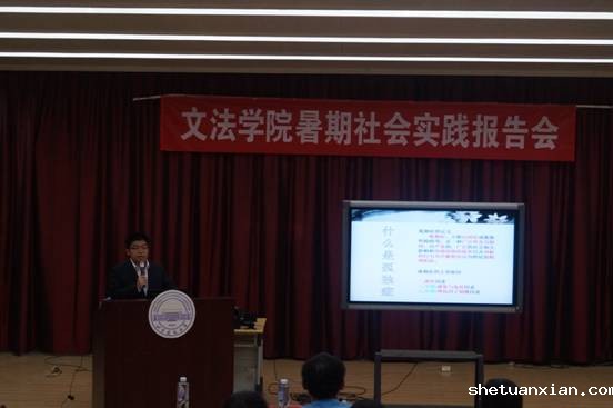 最后,肖建杰总结道:“文法学院高度重视学生的社会实践,2015年暑期社会实践更加实际,更加深入基层,参与的人数众多,涵盖的地域广、内容丰富,实践活动能紧密结合自己的专业去真正服务他人,服务社会基层,帮助弱势群体,真正做到了知行合一”。肖老师对大一新生提出两点期望:一是身体力行,在社会实践中找到自己的方向;二是立足专业,用专业解决社会问题。