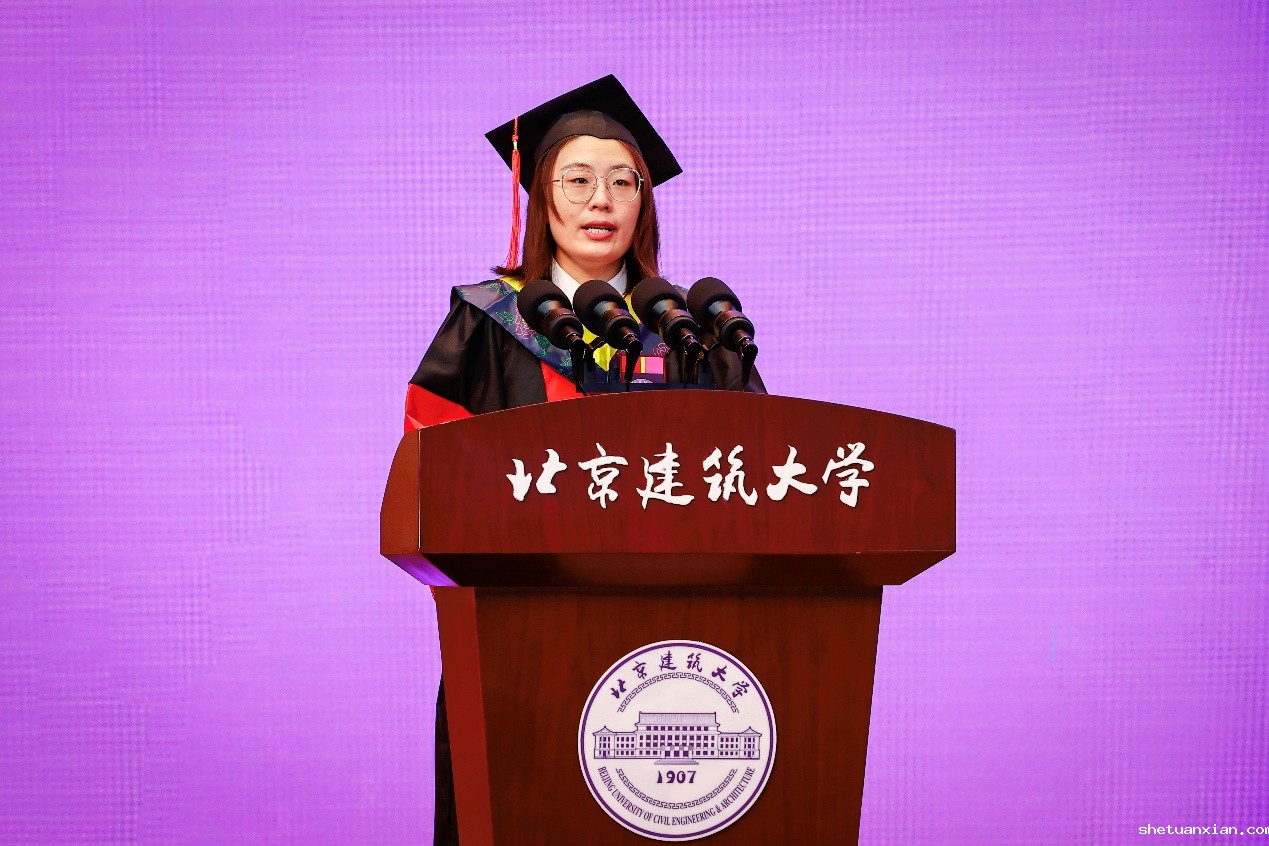 建筑学院建博18级徐磊作为研究生毕业生代表发言。作为学校“建筑遗产保护”专业发展的见证者和受益人,她已在建大校园生活学习近十年,期间,亲历了学校从作为最早设立“历史建筑保护工程”专业的高校之一,到博士人才培养项目,再到设立博士点的全过程,目睹了一批批优秀学子投身遗产保护事业,贡献出北建大智慧。她说,恰逢母校建校115周年之际,又听闻学校新增包括“历史建筑保护工程”在内的12个国家级及市级一流专业的喜讯,衷心祝愿母校英才辈出,再创辉煌!
