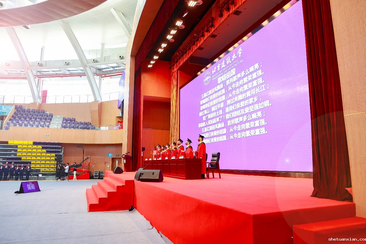 鲜艳的五星红旗冉冉升起,毕业典礼在嘹亮的国歌声中正式开场。