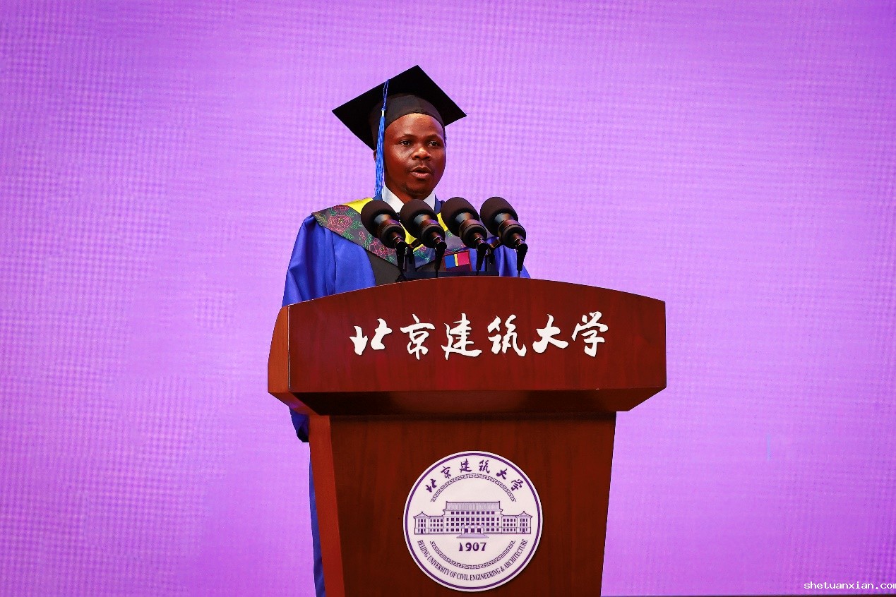 国际教育学院土研19级罗成作为留学生毕业生代表发言。来自卢旺达的他坦言,求学的3年是自己历练、成长、蜕变的过程,也是不断认识中国、了解中国、爱上中国的过程。在这里,他掌握了专业知识,也从导师严谨的治学态度、同学们刻苦的学习风貌中体会到了“实事求是、精益求精”的校训精神。“我将继续在北建大攻读博士学位,开启新的人生征程。在今后的学习中,我将不负母校的殷殷期待,把我在中国的所见、所闻、所学内化于心、外化于行,以自己的实际行动为两国友好交流做出新的贡献。”