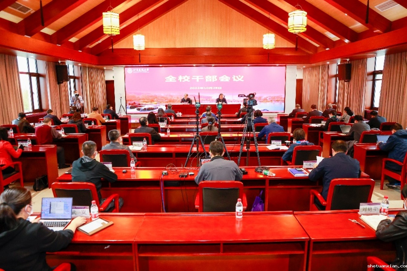 10月28日下午,学校召开全校干部会议学习宣传贯彻党的二十大精神。党委书记李军锋主持会议并讲话,党委副书记、校长张大玉传达党的二十大精神。全体校领导,全体处级干部,各二级单位党组织书记,各党支部书记,马克思主义学院全体教师,民主党派基层组织、统战团体负责人,党外代表人士参加会议。会议以视频形式在两校区和各分会场同步进行。