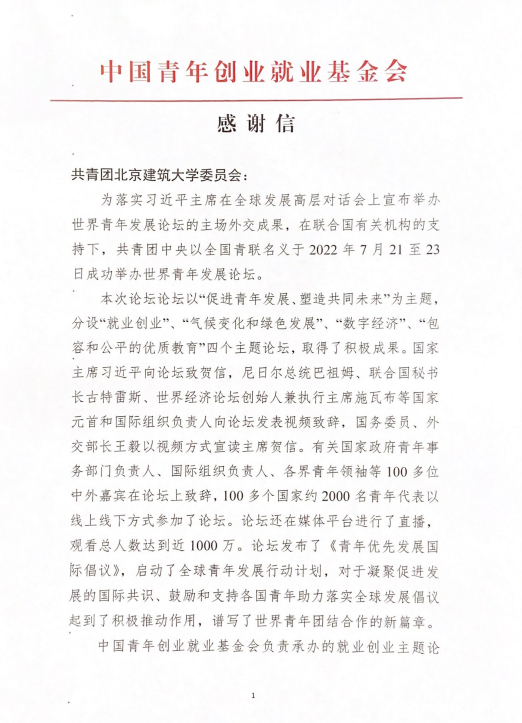 近日,中国青年创业就业基金会给我校发来的感谢信,对我校在世界青年发展论坛志愿者工作提出高度赞扬,并对我校为论坛成功举办做出的重要贡献表示衷心感谢。