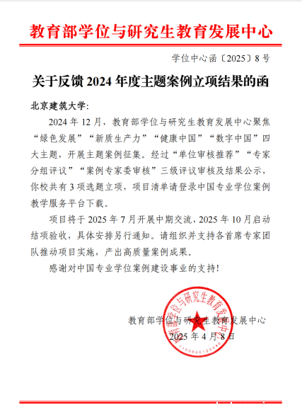 近年来,学校高度重视案例建设工作,依托往届中国专业学位案例中心案例库收录的14个案例与校级研究生教研项目建设案例,我校形成了一批有代表性、有说服力、有学理分析基础的研究成果,在助力培养拔尖创新人才和提升服务首都城市发展方面发挥了重要作用。学校将以此次立项为契机,进一步整合校内外优质资源,深化与领军行业、龙头企业的战略合作,强化健康可持续发展、数字信息技术等跨学科、跨行业的高水平案例库开发,着力夯实研究生教育教学基础,推动科研成果向教学资源高效转化,提高培养研究生解决复杂实际问题的能力。学校还将持续推进各类高水平案例开发、案例教材建设、优秀案例教师培育等工作,为服务新时代专业学位发展需求、促进研究生教育高质量发展贡献北建大力量。