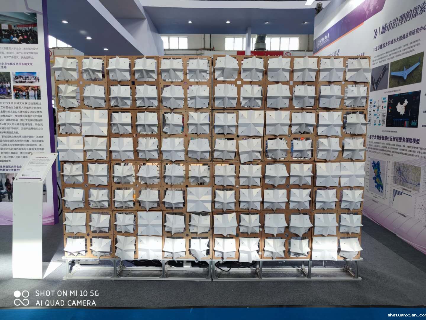 展览现场,学校展示了榫卯连接装配整体式剪力墙结构体系装配式建筑、行星水体净化搅拌机(海绵城市设备系列之一)、智能电动汽车充电桩系统、长城模型、学校科研人员主持编制的标准规范等实物以及云冈石窟多人VR互动系统、情绪动态交互墙(十字折叠智能表皮)等互动装置。