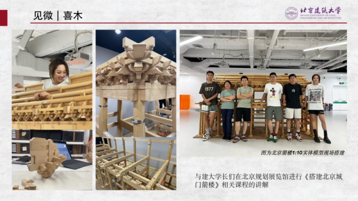 我也利用课余时间参与到古建以及北京中轴线的科普活动中,跟随见微·喜木团队在北京市规划展览馆进行相关课程的讲解。团队的创始人是建大的几个学长,他们身体力行,让我真实接触到在实际生活中的古建科普。相信学长们这样的职业选择也离不开学校的引导。