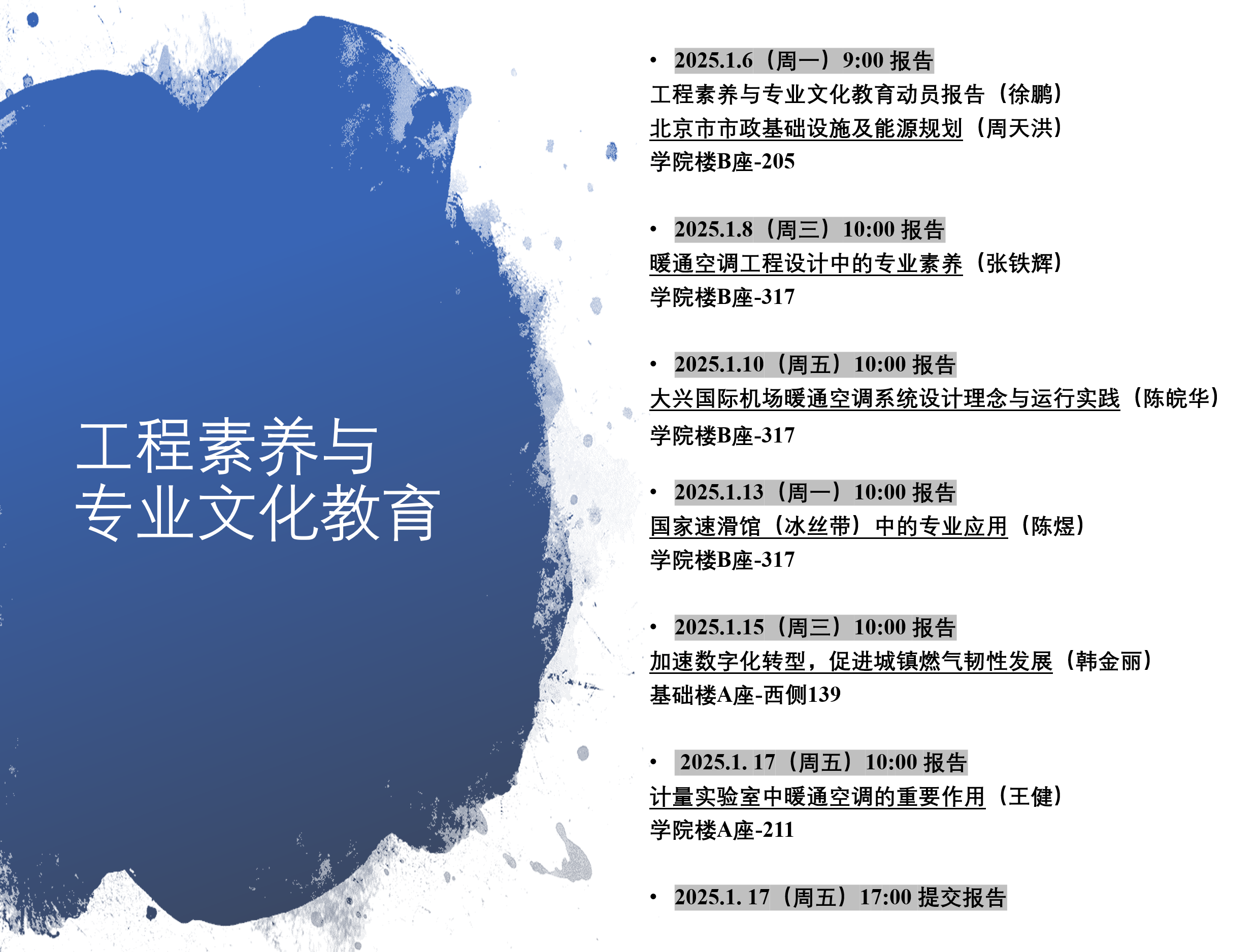 2025年1月6日至17日,环能学院建筑环境与能源应用工程专业为2023级学生开展了工程素养与专业文化教育。本次活动共邀请到6位业内知名专家和行业骨干到校,结合专业发展、校友成长亲身经验感悟和工程素养的养成等方面,实践环节将“人工智能+”融入其中,对行业前沿领域与师生面对面交流。
