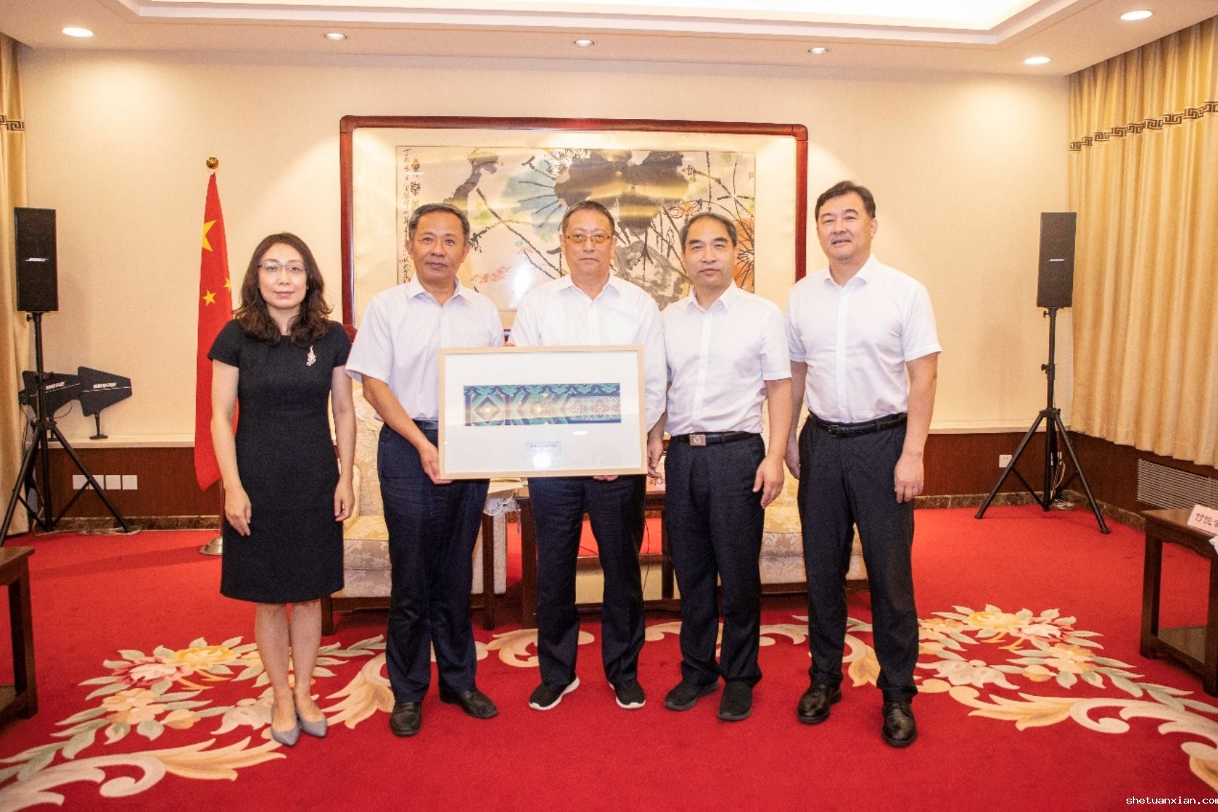 会后,校领导向郑建邦校友赠送建筑学院李沙教授创作的《墨线小点金旋子彩画》留念。