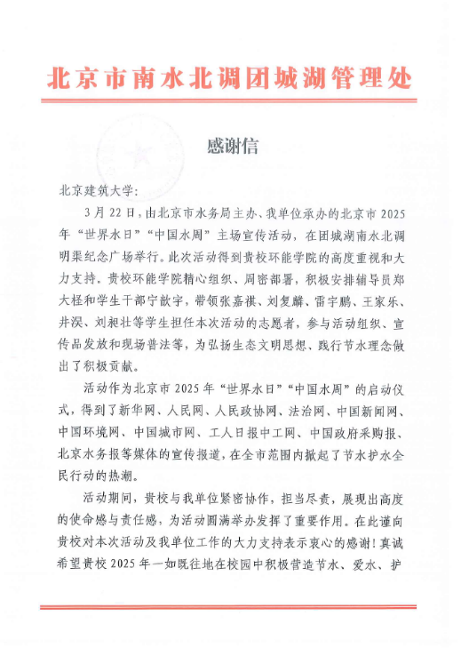 北京市南水北调团城湖管理处向我校环能学院辅导员郑大柽和学生骨干代表发来感谢信
