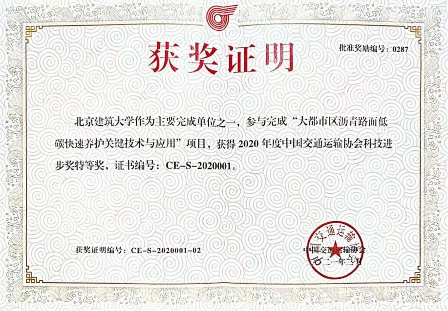 近日,中国交通运输协会颁发了《中国交通运输协会关于“2020年度中国交通运输协会科学技术奖”获奖项目的通知》(中交协秘字(2021)15号),我校作为主要完成单位、土木学院季节教授牵头完成的“大都市区沥青路面低碳快速养护关键技术与应用”项目获中国交通运输协会科学进步特等奖(仅两项),我校作为第一完成单位、土木学院徐世法教授主持完成的“高节能低排放冷拌冷铺沥青混合料开发与施工关键技术”项目获中国交通运输协会科学进步一等奖。
