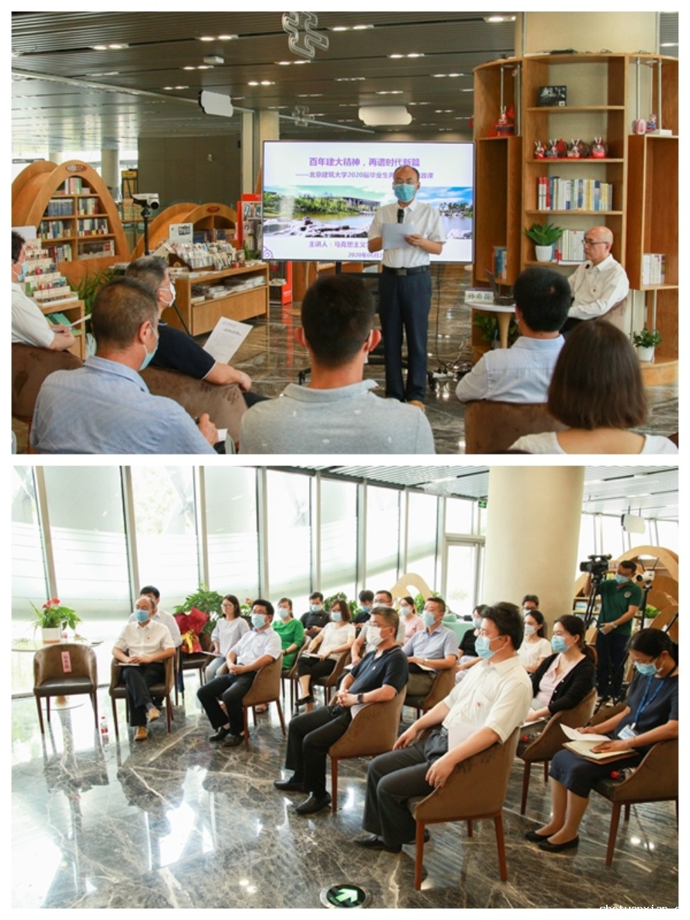 孙希磊老师就目前国内疫情防控形势进行了分析,围绕中国展现出的强大制度优势和卓越治理能力进行了深入讲解,引导学生去品读和感受疫情大考下的中国精神、中国速度和中国力量,勉励同学们在抗击疫情中厚植家国情怀,努力成为担当民族复兴大任的时代新人!孙老师在百年的历史视域中,为毕业生们阐释了母校和历代北建大人的初心:以实业救国、教育强国为己任,以振兴中国工业、振兴中国建筑、造福人民安居、建设美丽城乡为使命,培育大国工匠,铸造工匠精神。他列举了多位著名校友的事例加以阐释。孙老师深刻分析了首都北京发展的新蓝图,并创造性的提出“北京模式”的理念。他希望同学们要将个人发展融入这一难得的历史机遇,把个人的理想和追求融入到首都北京、国家和民族的发展之中,为国家和社会做出贡献。他深入分析了“敬业、精益、专一、创新”的工匠内涵及其当代价值,并鼓励同学们勇做新时代大国工匠。在继承中国古代工匠精神传统,借鉴国外工匠精神的基础上,他向毕业生们发出了三点倡议,要胸怀祖国、放眼世界、志存高远、笃实奋进;要做大国工匠,以此为立身之本,要科技致用,以铸强国之魂;要脚踏实地、勤勉求学、忘我奋进、扩大视野。