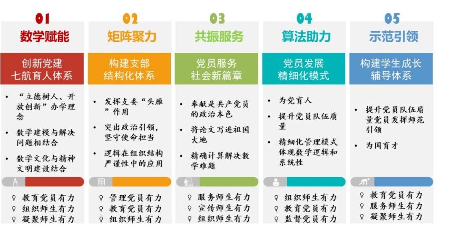 党支部创建“五力聚合”党建实践模式,坚持以数理为基础,以党建为引领,探索出一条数学与党建深度融合的特色发展之路,为培养高层次、创新型数理人才提供坚强保障。支部践行“数理是科技发展的基石,而党建工作则是支部精神的灯塔”的理念,在实践中充分发挥党员的先锋模范作用,引领师生用专业知识服务于首都的“四个中心”建设。党支部特设“党建精英专班”、打造“我来+”系列品牌活动、实施“三精管理”策略、系统性开展支部理论学习和主题党性实践活动,注重将理论学习与工作实践相结合,不断提高党支部党建工作、人才培养和社会服务水平。