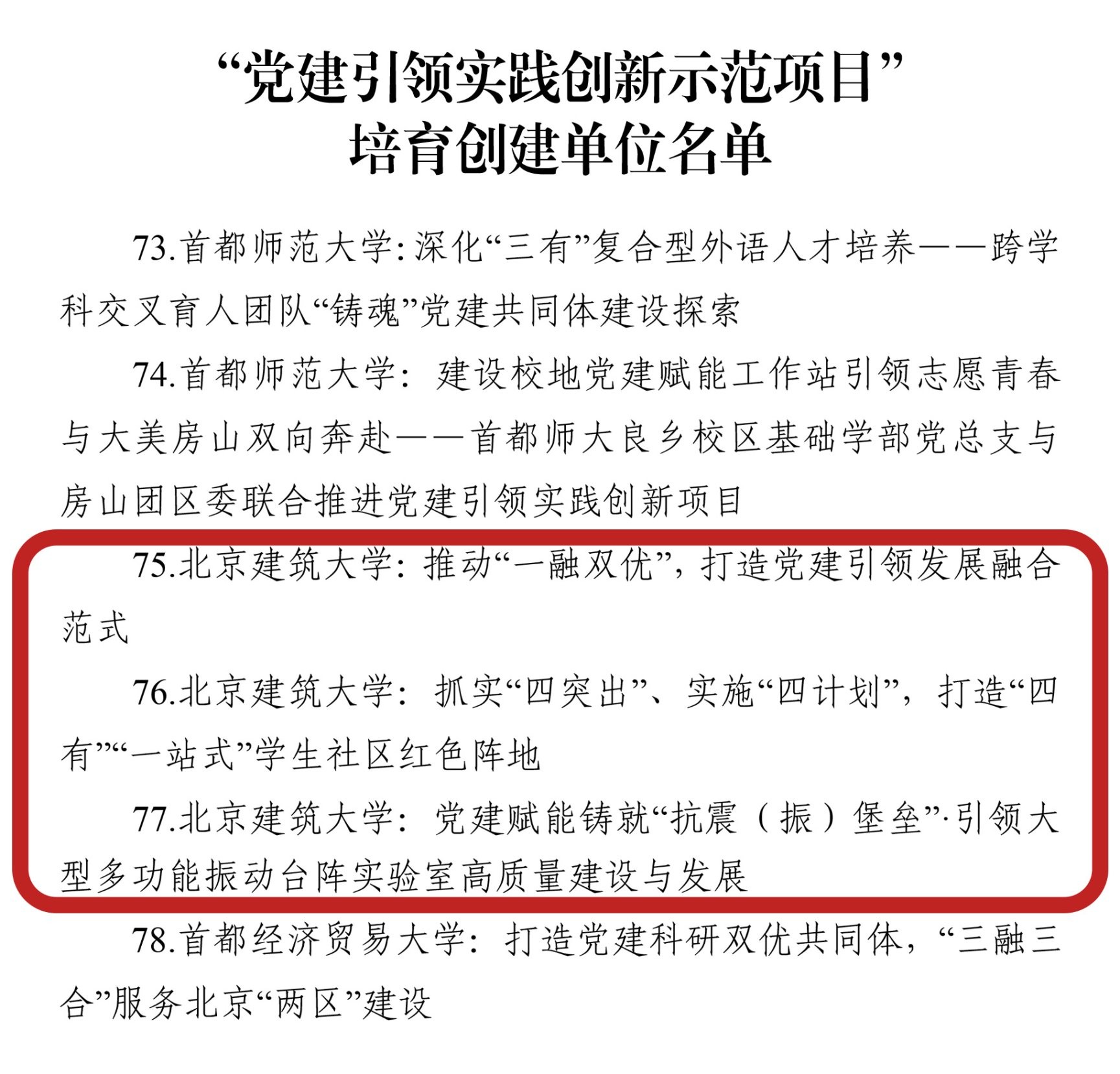 8月12日,北京市委教育工委对北京高校党建工作“标杆院系”“样板支部”“党建引领实践创新示范项目”培育创建工作评选结果进行公布,我校建筑与城市规划学院、测绘与城市空间信息学院入选北京高校党建工作“标杆院系”;城市经济与管理学院工程管理系教师党支部、机电与车辆工程学院工业工程系党支部、马克思主义学院教职工第二党支部、理学院研究生第二党支部入选北京高校党建工作“样板支部”;推动“一融双优”、打造党建引领发展融合范式,抓实“四突出”、实施“四计划”、打造“四有”“一站式”学生社区红色阵地,党建赋能铸就“抗震(振)堡垒”—引领大型多功能振动台阵实验室高质量建设与发展入选北京高校“党建引领实践创新示范项目”培育创建单位。至此,学校在全国和北京市“双创”评选数量已达19项,培育创建数量在市属高校中名列前茅。