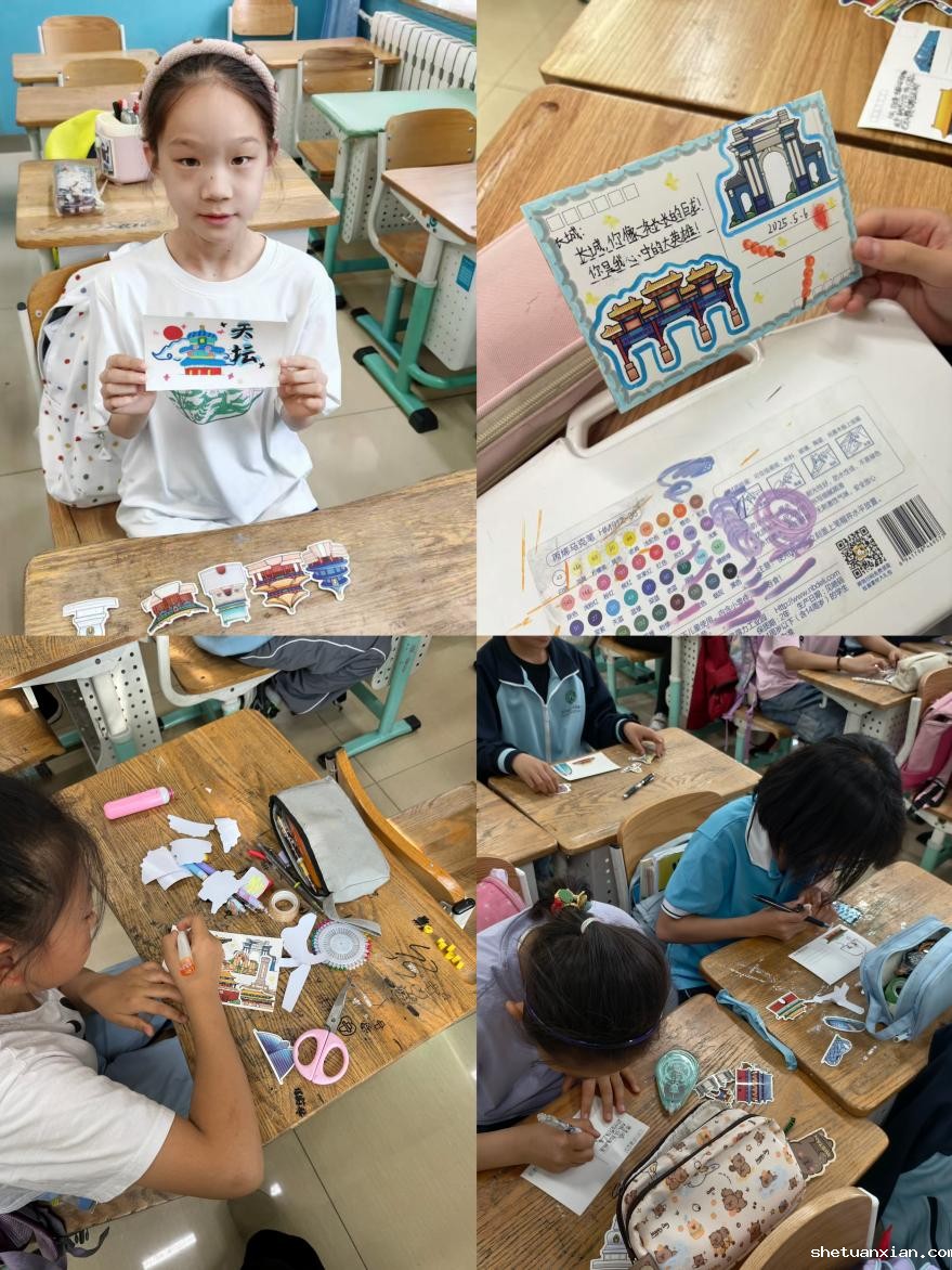 为深化学习体验,研究生团队创新设计“DIY文化遗产明信片”环节。孩子们以彩笔为媒、以贴纸为语,在空白明信片上勾勒天坛祈年殿的轮廓,用稚嫩笔触书写“守护长城”“故宫不老”等童言寄语。这一过程不仅激发了孩子们的创造力,更让“文化遗产小卫士”的使命感从纸面跃入心间。课程尾声,研究生“小老师”们以“彩蛋预告”形式,抛出未来四讲课程的文化谜题,持续点燃孩子们对传统文化的探索热情,让同学们在期待中萌发对后续课程的热情。